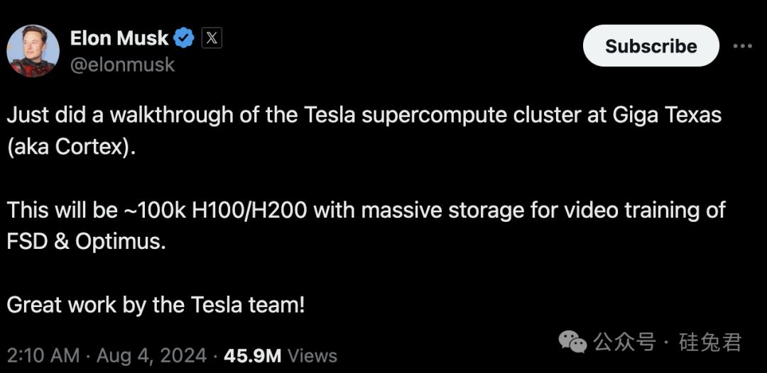 马斯克在X上发帖称,他参观了“Giga Texas(又名 Cortex)的特斯拉超级计算集群”。他指出,该集群将由大约 100000 个 H100/H200 Nvidia GPU 组成,并配备“用于 FSD 和 Optimus 视频训练的海量存储空间”。