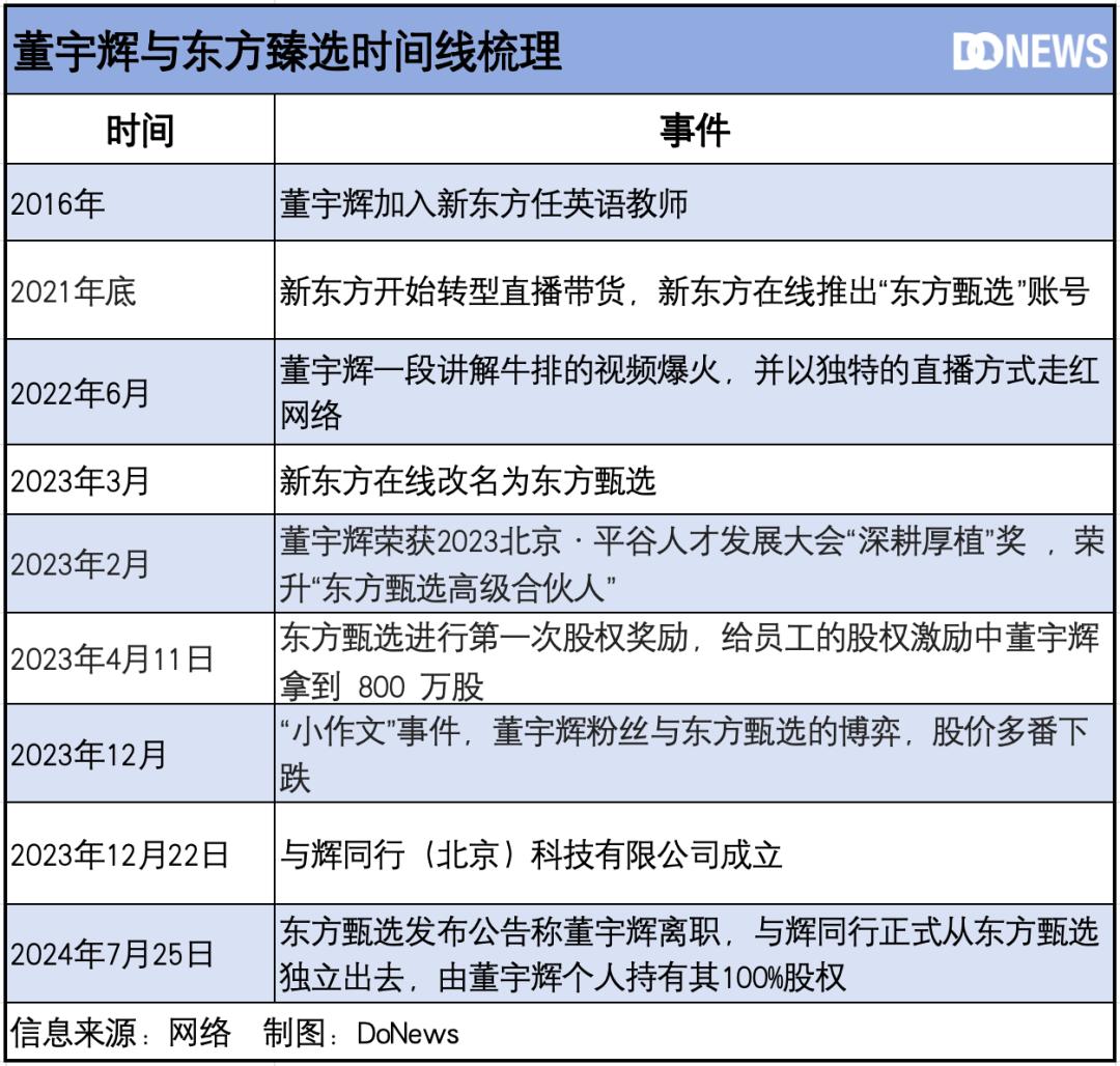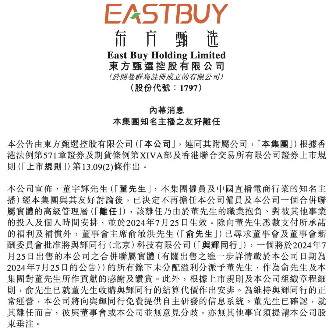 事情过去半年多,双方选择了“分手”。7月25日,东方甄选(1797.HK)公告董宇辉离职,东方甄选全资子公司与辉同行正式从东方甄选独立出去。