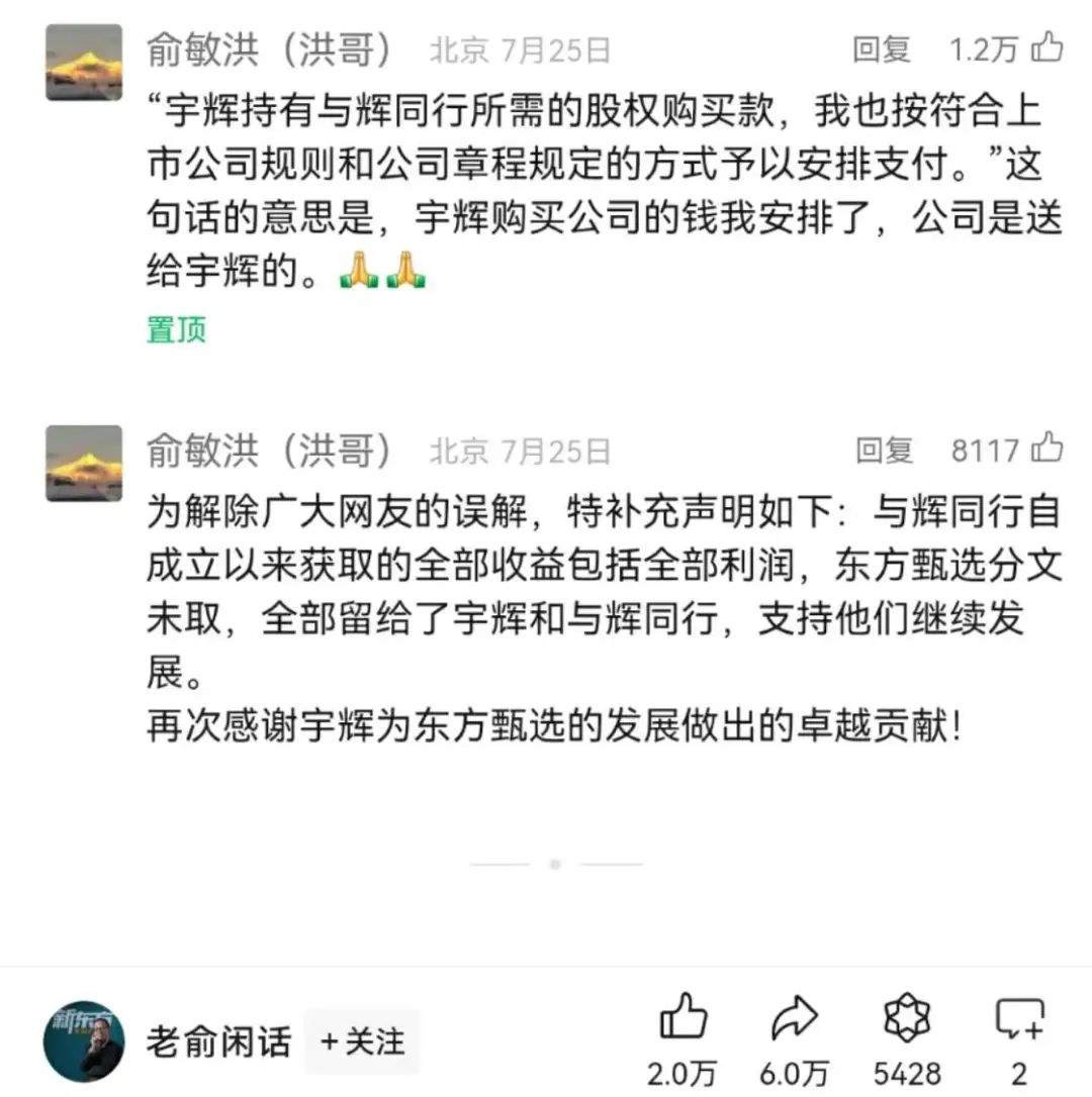 他还表示,对与辉同行的剥离非常遗憾,但基于东方甄选所面临的现实情况,这一结果是不可避免的,甚至对公司的发展是有好处的。这并不是强行挽尊,而是事已至此,董宇辉和俞敏洪合则两败,分则两立,双方做了最合适的决定。