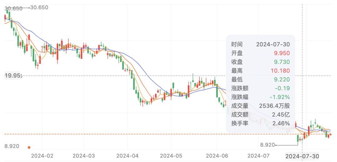 如果我们将时间线拉回到2024年的1月2日,当时东方甄选的开盘价为28港元,而到了7月30日收盘时,其股价已经跌至9.730港元,这意味着年内股价跌幅达到了65.3%,与2023年初的股价高点75.55港元相比,东方甄选的股价下跌了87.1%,市值减少了678.6亿港元。