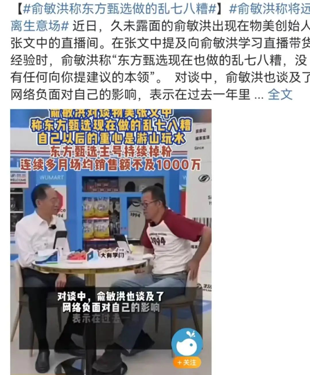 6月初时,俞敏洪曾在物美创始人张文中的直播间中表示过东方甄选做的乱七八糟,主号持续掉粉,连续多月场均销售不及1000万。