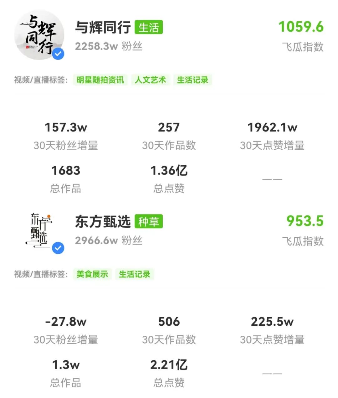 据飞瓜数据,与辉同行近30天的粉丝增量为157.3万,点赞增量1962.1万。东方甄选这边就惨了,近30天点赞增量连前者零头都没有不说,粉丝量还减少了27.8万。相比而言,董宇辉确实更适合直播。