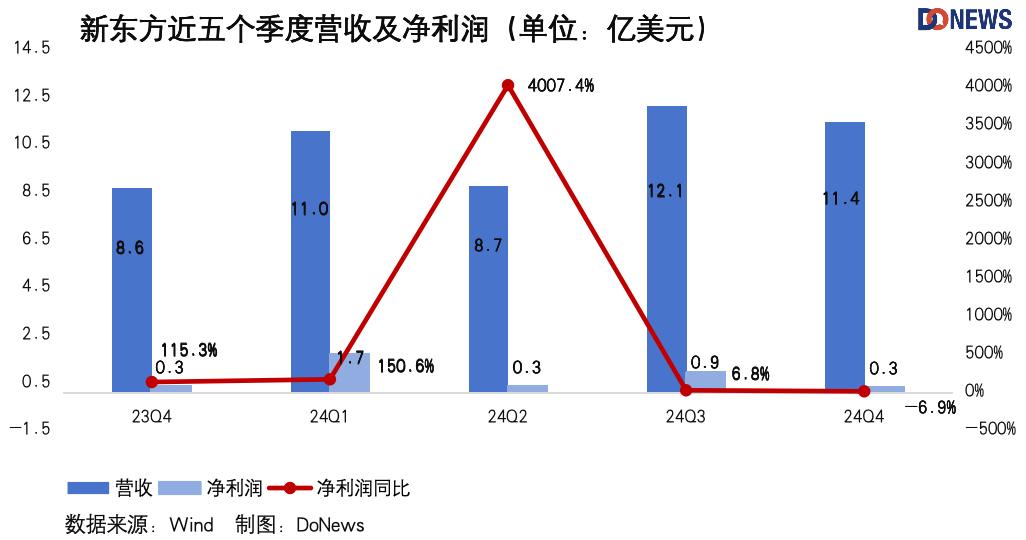 财报显示,2024财年第四季度新东方净营收同比增长32.1%,达11.367亿美元(约88.6亿港元);股东应占净利润同比下跌6.9%至2700万美元(约2.1亿港元);经营利润为1050万美元(约8186万港元),同比下降78.1%;经营利润率为0.9%,上一财年同期为5.6%。