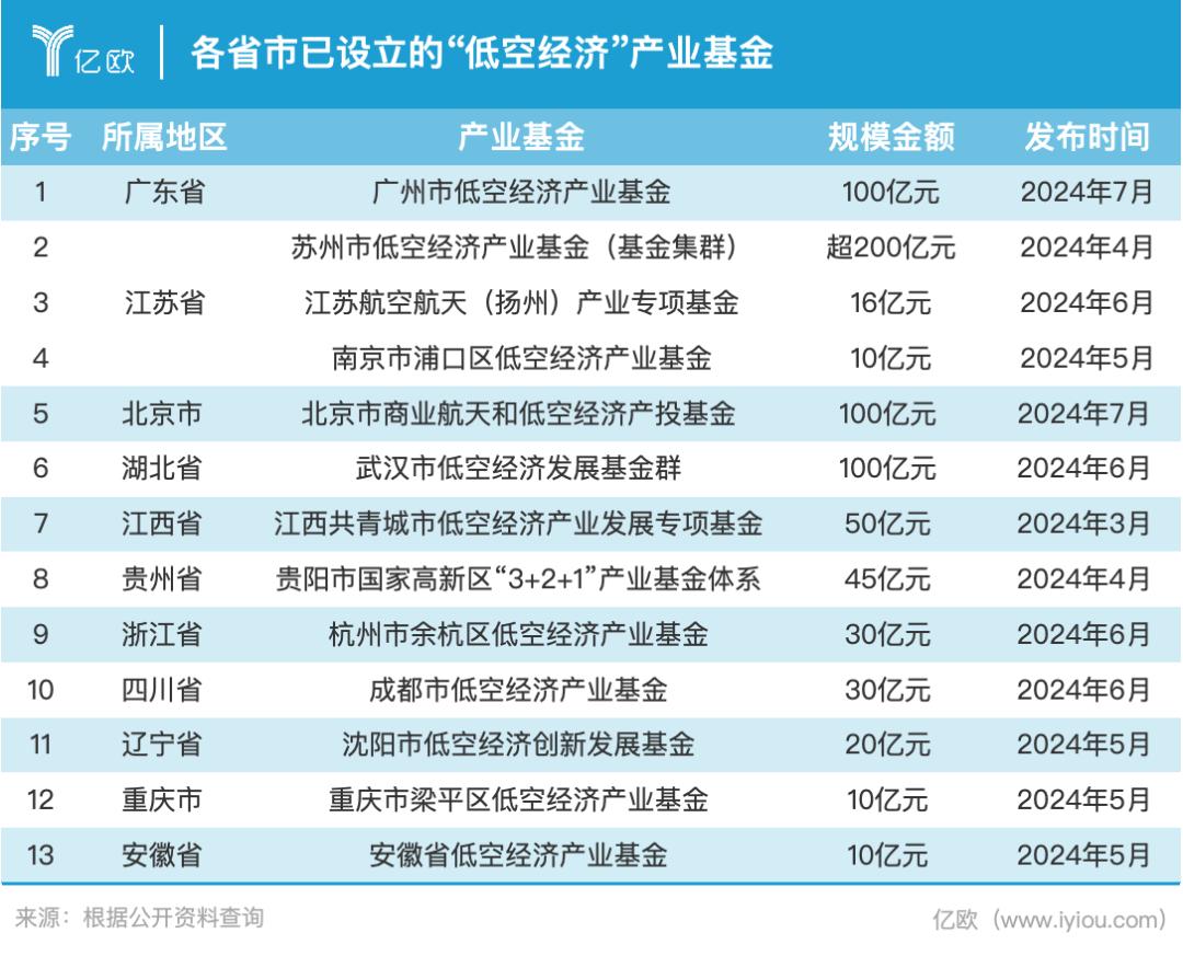 今年以来,各地政府相继成立低空经济产业基金。目前,苏州、北京和广州的产业基金规模领先,苏州的低空经济产业基金总规模已经超过200亿元。