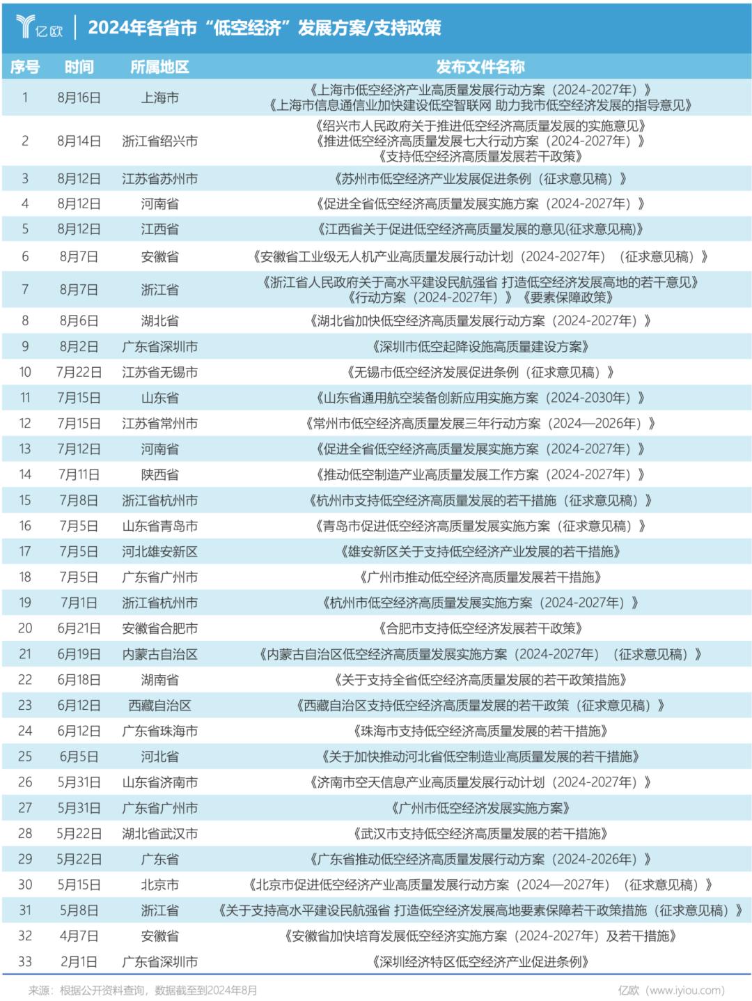 除了深圳以外,根据亿欧不完全整理,今年以来,已有33个省市陆续召开低空经济发展会议,发布低空经济相关发展方案或者促进条例等文件。