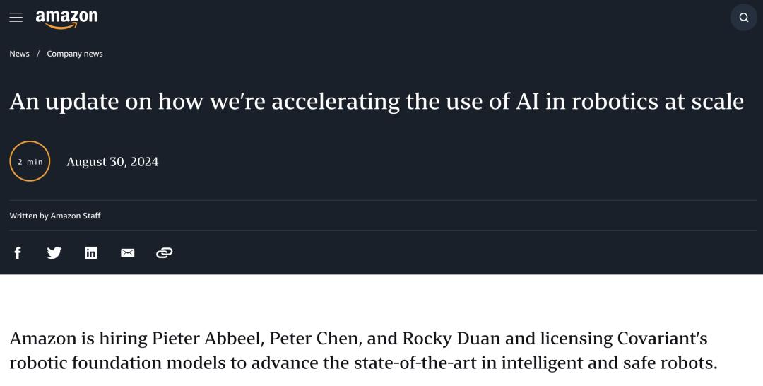 亚马逊刚刚官宣,从机器人AI系统初创公司Covariant挖走了三名联创。