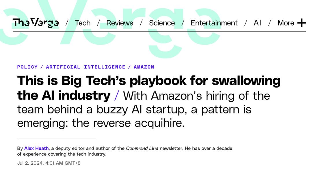 The Verge副主编Alex Heath在一篇文章中直言,亚马逊此举实际上就是变相收购,并且亚马逊的动作也引起了市场监管部门的注意。