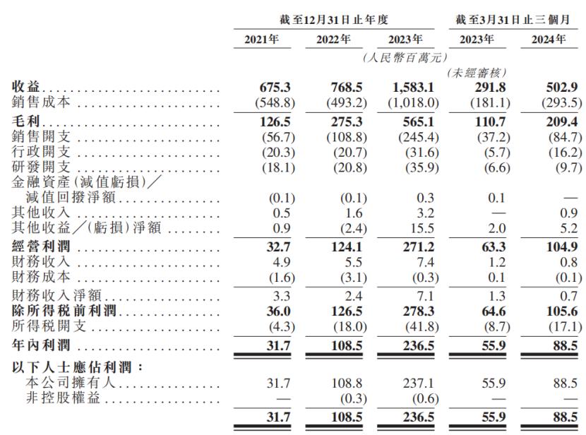 2021年、2022年、2023年及2024年1-3月(简称“报告期”),公司收益分别为6.753亿元、7.685亿元、15.831亿元、5.029亿元;