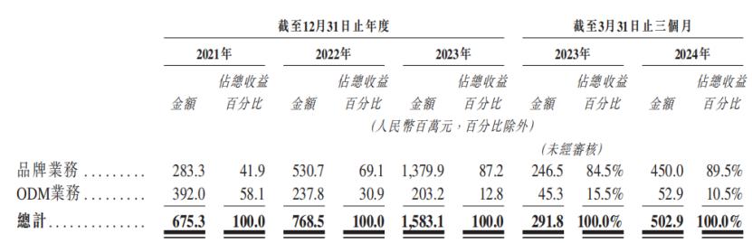 按产品划分的品牌业务收益的明细,来源招股书