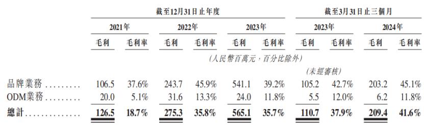 按业务分部划分的毛利及毛利率明细,来源招股书