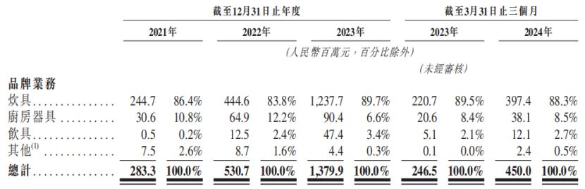 炊具是公司的核心业务,营收占比超过了80%。报告期内,炊具收益由2021年的2.45亿元增至2023年的12.38亿元,复合年增长率达到124.9%。