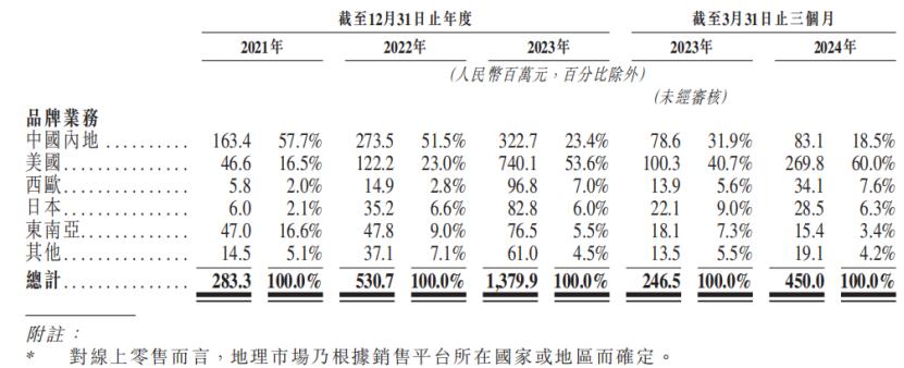 按地理位置划分的品牌业务收益明细(仅品牌业务部分,不含ODM),来源招股书