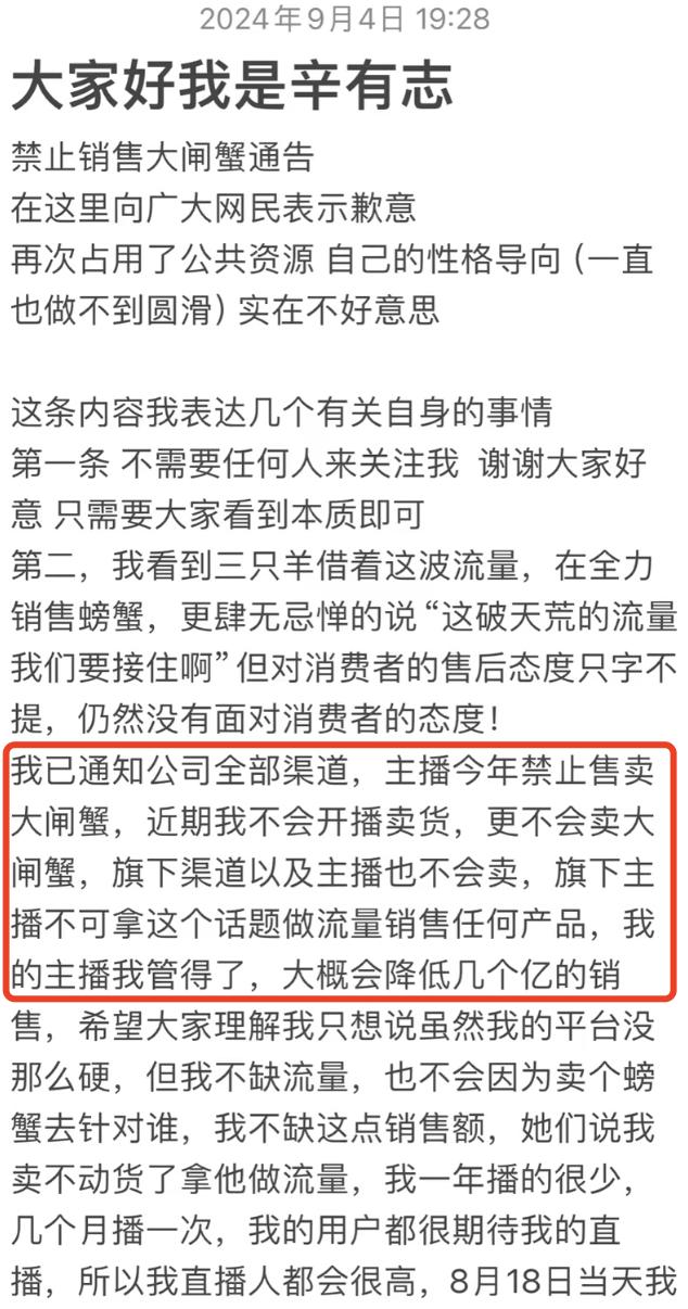 9月4日晚间,辛巴发文称,禁止公司旗下主播在今年售卖大闸蟹,近期自己也不会再开播卖货。小杨哥兄弟则在近期的直播中换了“苏状元”品牌的蟹卡进行销售,“蟹太太”礼盒只上架旗下其他矩阵号。
