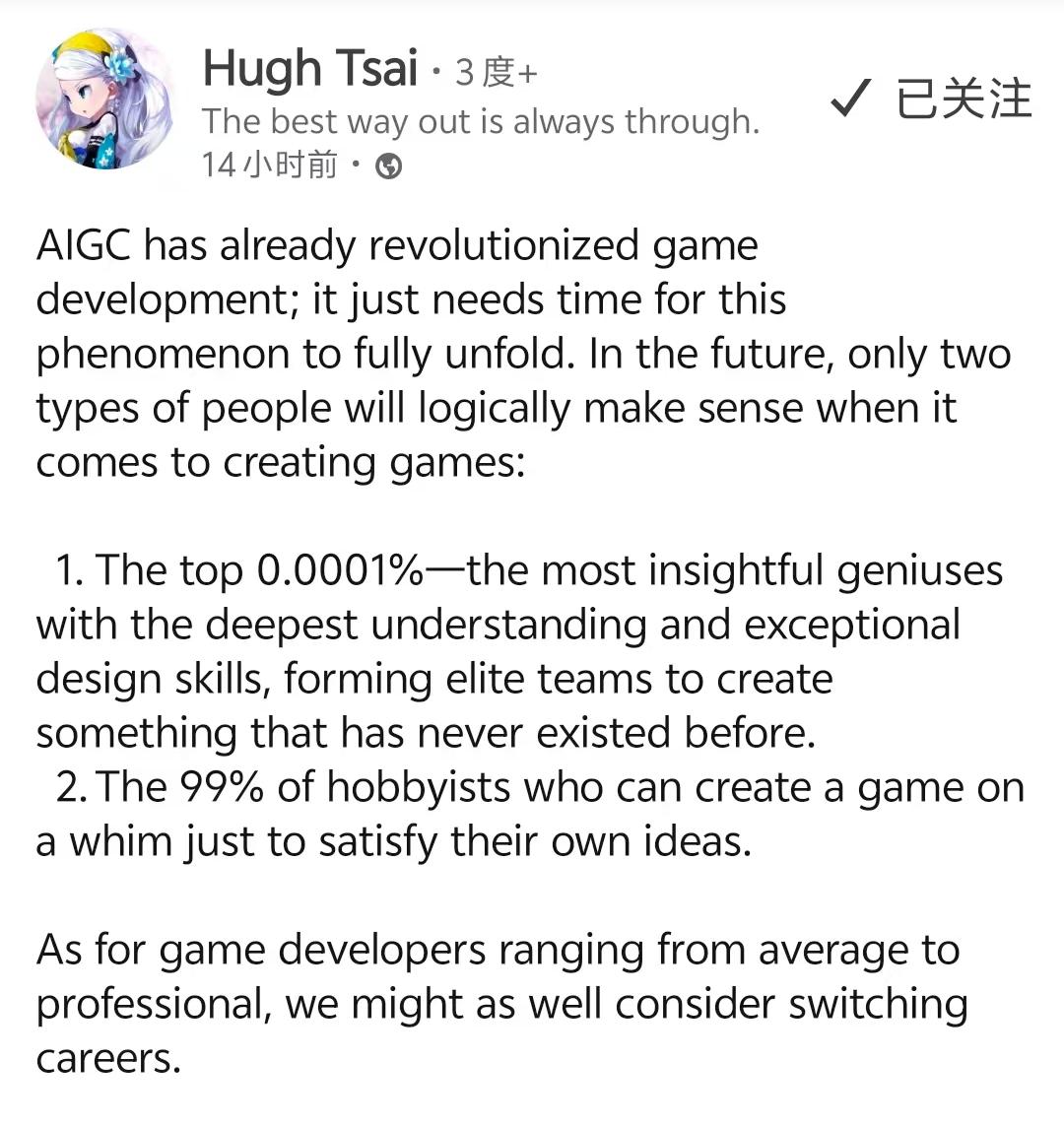 上个月底,蔡浩宇在领英上发文,称AIGC已经彻底改变了游戏开发,未来只有两种人制作游戏是有意义的——