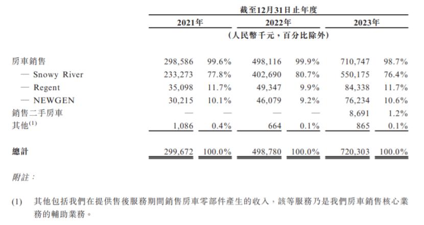 从收入结构来看,2021年至2023年,新吉奥房车98%以上的收入来自房车销售业务,其中超过70%的收入由Snowy River品牌贡献。