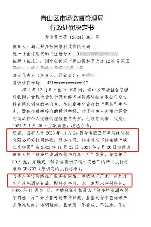 近日,职业打假人王海发布视频称,小杨哥带货的假原切牛肉卷公司已被罚款50万元。监管处罚信息显示,今年7月“鲜多裕”因虚假宣传被市场监督部门罚款50万元。