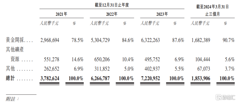 公司绝大部分收入来自黄金销售,黄金开采销售的收入占比由2021年的78.5%提升至2024年1-3月的90.7%,占比逐步提升;其他矿产资源产生的收入占比有所下降。
