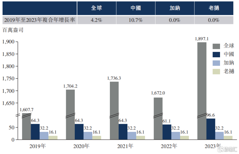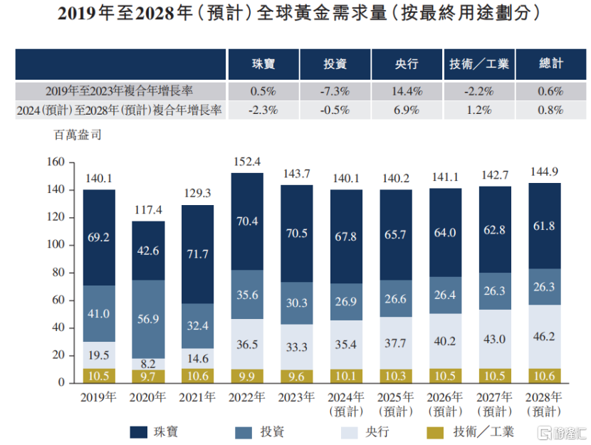 2019年至2023年,全球黄金需求量增长,复合年增长率为0.6%,2023年达1.437亿盎司。2023年黄金需求量同比减少,主要是因为投资及央行的黄金储备需求下降。