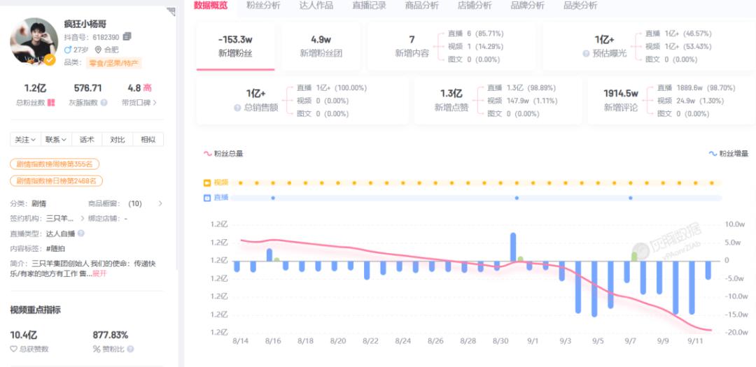 陷入被动的小杨哥即便收起了往日的高调画风,也还是没挡住铺天盖地的舆论攻势。锌刻度从灰豚数据查询到,从8月31日至9月12日间,抖音账号“疯狂小杨哥”已经掉粉153.3万。