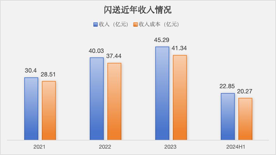 根据招股书的信息,闪送在2021年、2022年、2023年和2024年上半年的营收分别为30.40亿元、40.03亿元、45.29亿元、22.85亿元。
