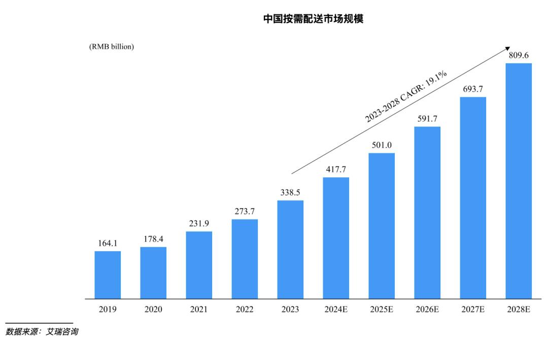 根据艾瑞咨询的数据,2019年至2023年,中国按需配送市场的总市场规模从1641亿元增长至3385亿元,复合年增长率为19.8%,预计到2028年市场规模将以19.1%的复合年增长率增长至8096亿元。
