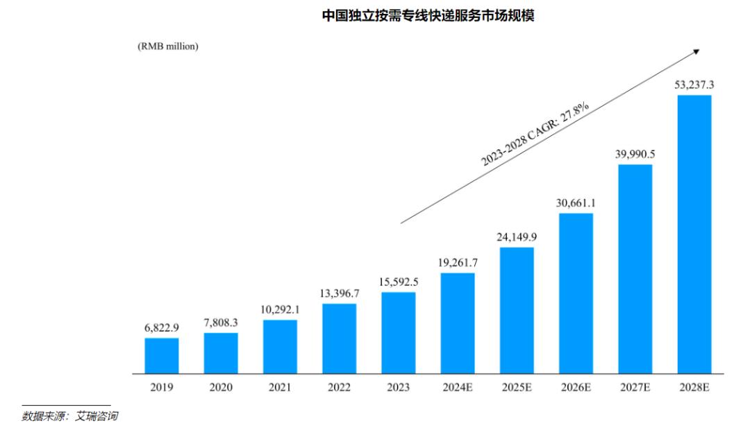 闪送所属的独立按需专线快递市场,预计将从2023年的156亿元增长至2028年的532亿元,复合年增长率为27.8%,超过中国整体按需配送市场的增长。