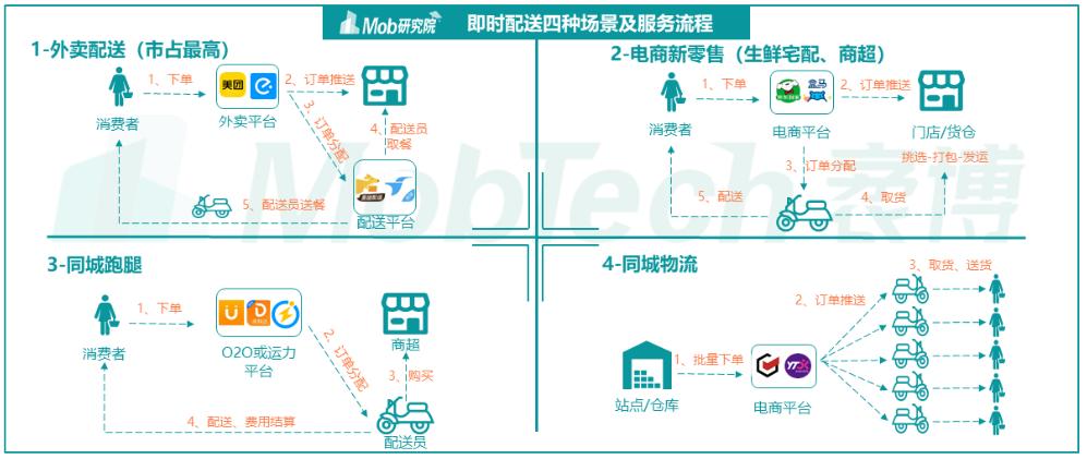 2022年Mob研究院的一份研报显示,即时配送服务中,外卖配送业务为最主要的场景,呈现出美团配送和蜂鸟即配双龙头竞争态势。闪送主打的“一对一”配送,所占的市场规模较小。