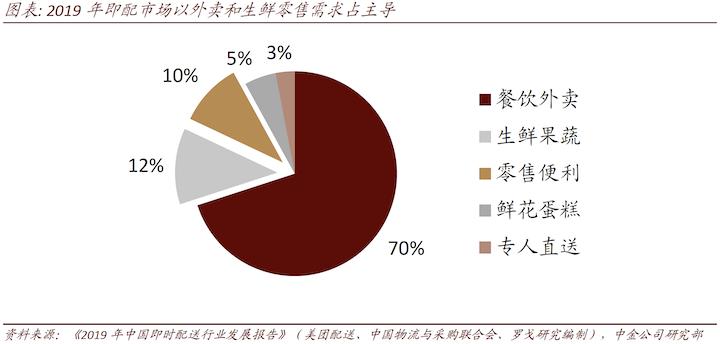 中金公司2020年发布的《即时配送:数字经济赋能的蓝海市场》也显示,2019年,即时配送的应用场景中,餐饮外卖订单量占比 70%、生鲜宅配占比12%、 商超便利占比10%、鲜花蛋糕占比5%、C2C配送(“一对一”配送)占比3%。