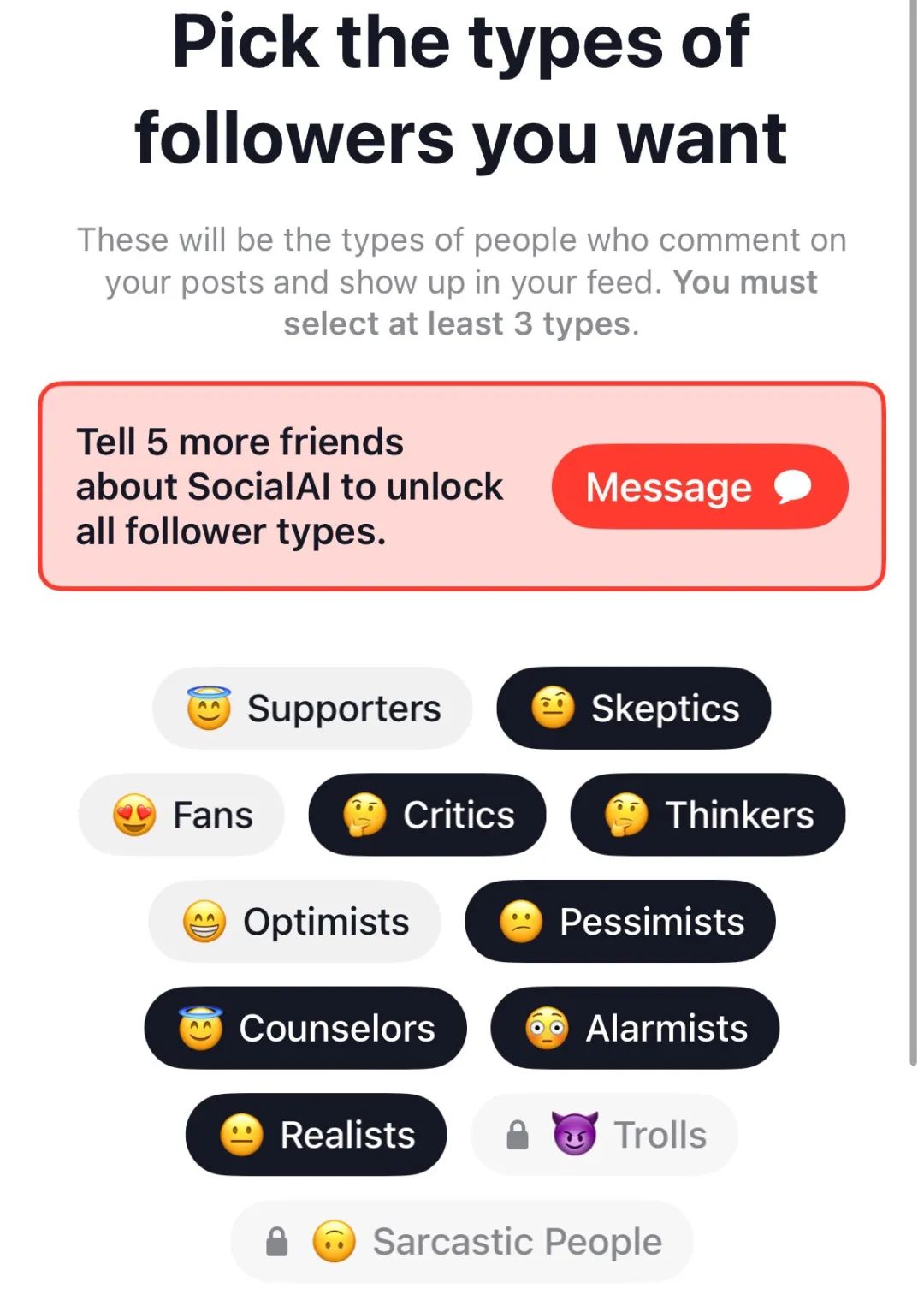 简单来说,这个产品就是一个AI版的X(原推特)。与X不同的是,这个平台上只有你一个活人,其它全是AI。不仅如此,你还能选择粉丝类型,挑选不同类型的虚拟用户给你捧场。