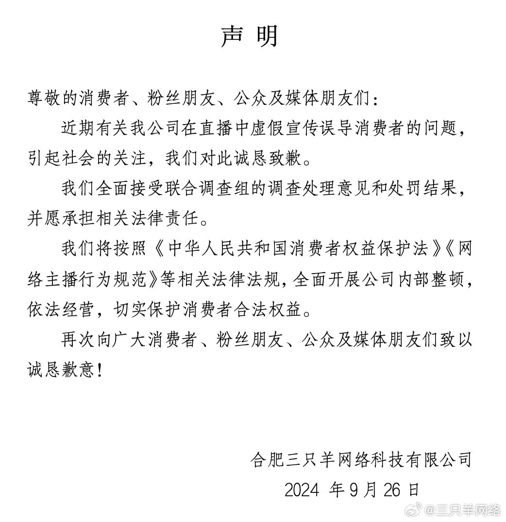随后三只羊发布公告,承认在直播中虚假宣传误导消费者的问题,并对此诚恳致歉。
