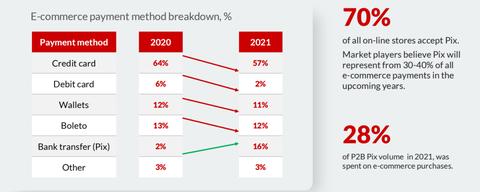全球金融科技公司 ebanx 也发布报告称,2023 年,巴西即时支付系统Pix拥有该国线上支付29%的市场份额,过去三年中近80%的首次网购客户选择使用Pix付款;并预计,2026年Pix将占巴西在线支付的 40%。