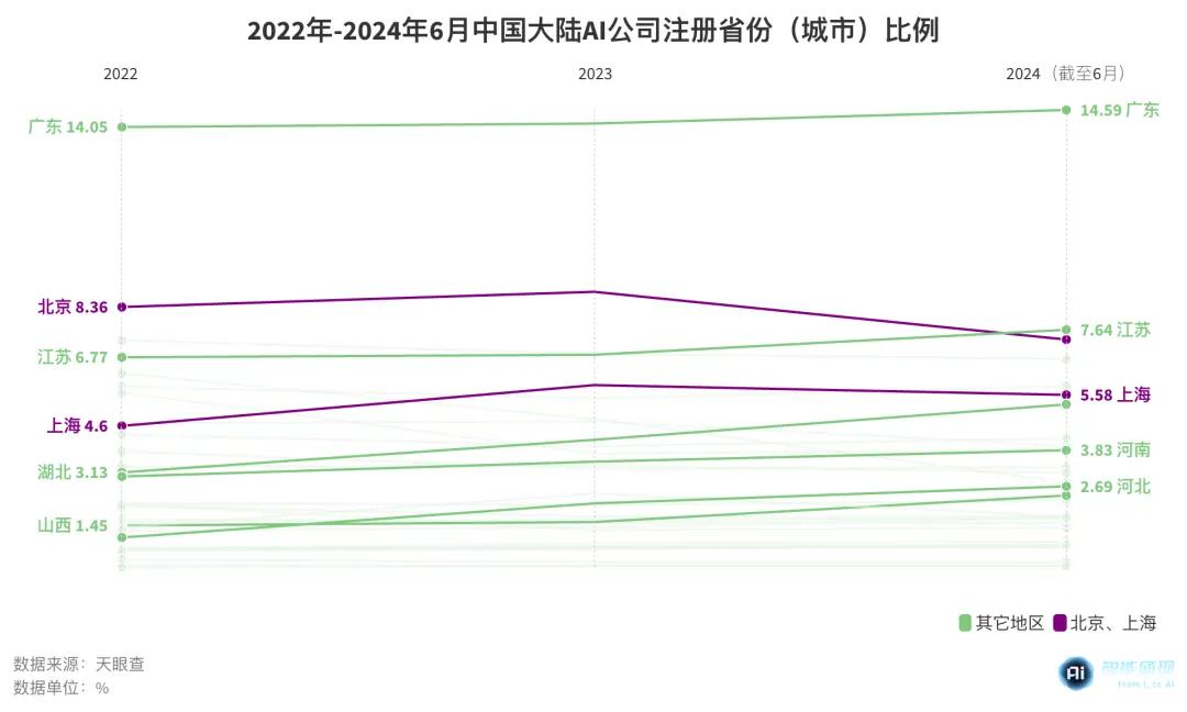 据天眼查统计,2023年以来,北京、上海对AI初创公司的吸引力在下降,非一线城市的AI新公司数量反而在一路上升。