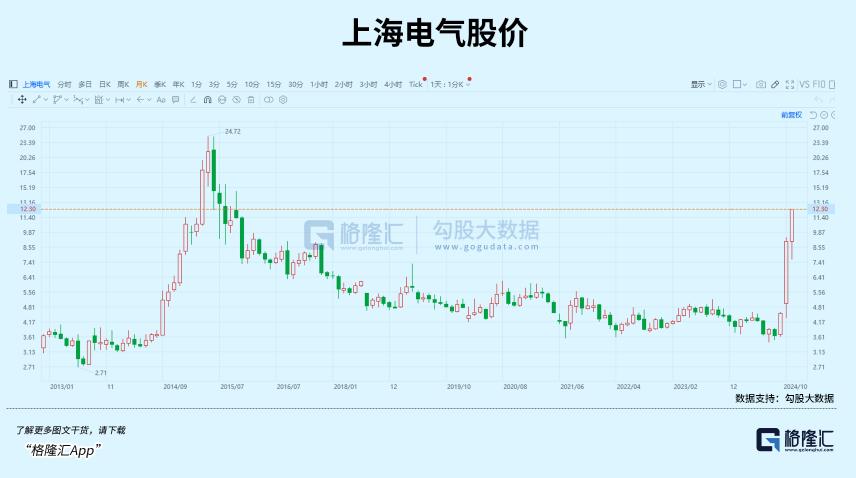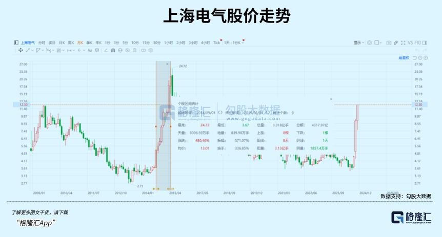 从2014年9月到次年5月份,上海电气市值一共飙涨了4.8倍,比如今还要更夸张。