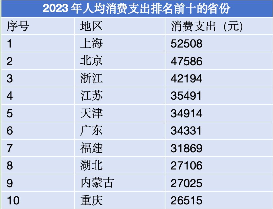 2023年,上海、北京、浙江、天津、江苏、广东、福建、山东这八个省份的居民人均可支配收入超过全国平均水平。与收入水平相对应,这些人均收入排在前列的省份也占据了2023年各地居民人均消费支出排行榜上的第一阵营。