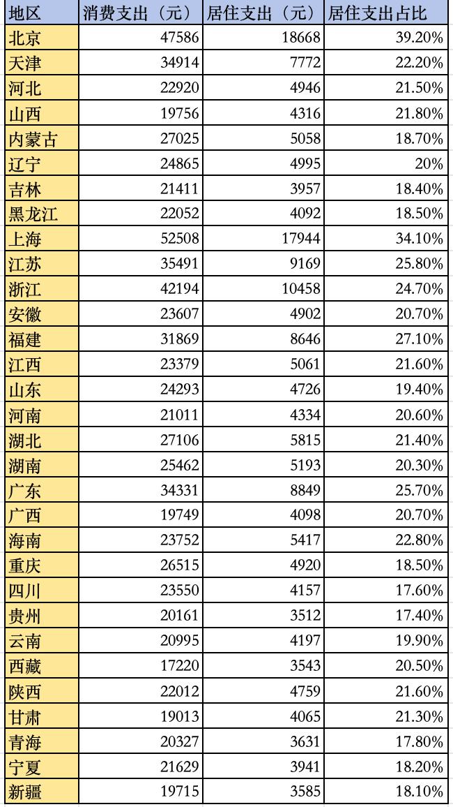 而从居住消费支出来看,北京、上海、江苏、浙江、福建、广东均超过了8000元。从区域分布看,人均居住消费超过8000元的省份均位于东部沿海发达地区,这些地方整体房价和租金水平都比较高。