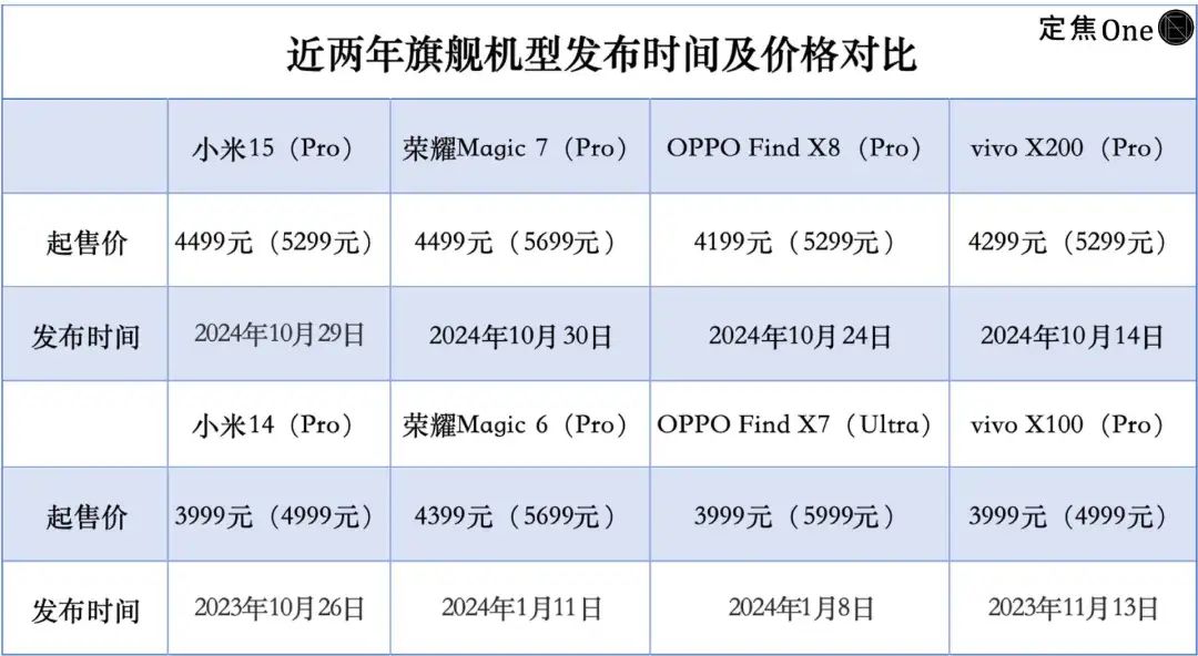 据「定焦One」梳理,厂商们首先是提前了发布时间。自从今年9月苹果发布iPhone 16系列以来,小米、荣耀、OPPO、vivo等厂商都已发布了最新的旗舰机型,发布时间均较上一代机型有所提前。