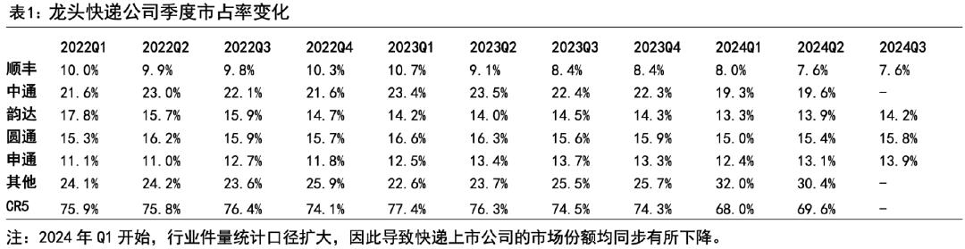 同时,“时效快递”属于“小而美”的业务,其他快递都与电商平台进行绑定,时效虽慢但胜在量大。根据国信证券的一份报告显示,顺丰的市场份额一直低于三通一达,且从2023年Q1开始逐渐降低。