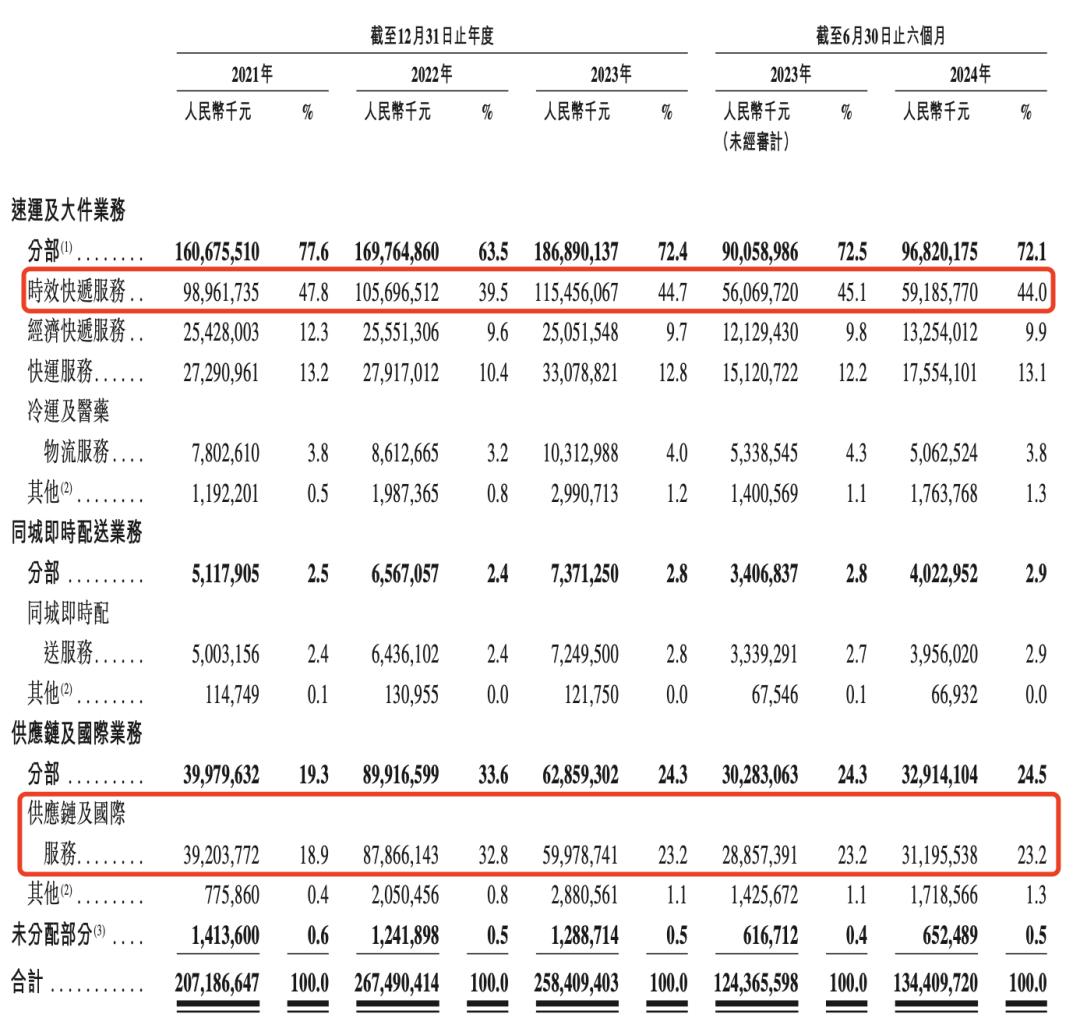 根据招股书显示,顺丰的业务分为速运及大件业务、同城即时配送业务、供应链及国际业务三个部分。其中,时效快递还是主营业务,带动速运板块成为公司的支柱业务,这一业务从2021年到2023年都在稳定增长。
