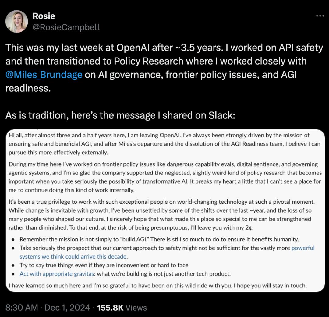 她在X上说到“这是我在OpenAI工作约3.5年后的最后一周。我先是从事API安全工作,然后转到了政策研究部门,在那里我与@Miles_Brundage 紧密合作,共同研究人工智能治理、前沿政策问题以及通用人工智能(AGI)的准备情况。”