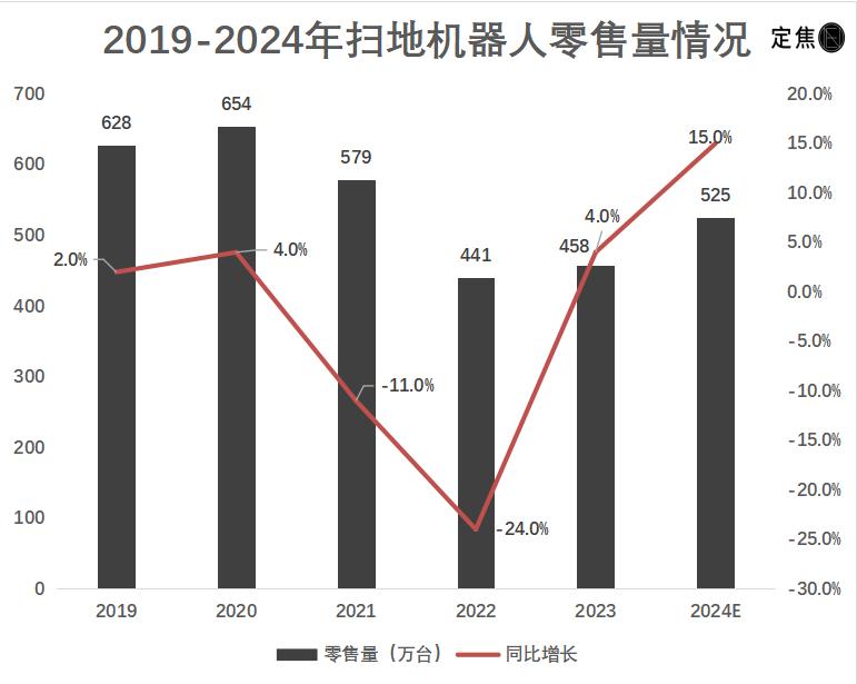 中商产业研究院发布的《2024-2029年中国扫地机器人行业市场前景预测及未来发展趋势研究报告》显示,2019年-2020年是扫地机器人高速发展的阶段,零售量超600万台,后来销量有所下滑。去年这一市场有所回暖,全年零售量458万台,同比增长4%。