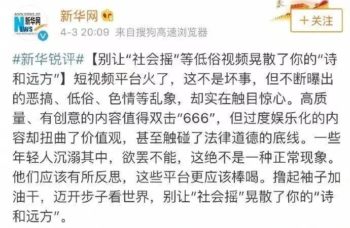 2018年4月3日,新华网点名批评“社会摇”现象,认为其败坏了社会风气,影响了青少年的健康成长,呼吁“别让社会摇等低俗视频晃散了你的‘诗与远方’”。次日,国家广播电视总局发布一则名为《国家广播电视总局严肃处理“今日头条”“快手”传播有违社会道德节目等问题》的通知,表示两家网站长期无视法规训诫、扰乱网络视听,责令其立即采取整改措施,并将违规网络主播纳入跨平台禁播黑名单,禁止其再次注册直播账号。