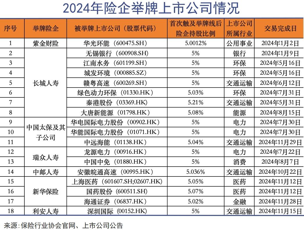 2024年全年险资举牌次数达到了20次。举牌方包括紫金财险、长城人寿、瑞众人寿、新华保险等8家保险机构,举牌次数和被举牌上市公司家数均创下2021年以来的新高。