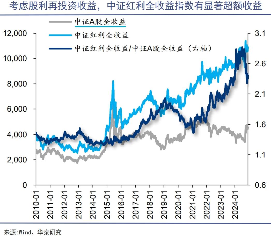 2024年市场上银行股等红利资产的优秀表现自不必说,事实上在考虑股利再投资收益的情况下,中证红利全收益2010年以来相对中证A股全收益指数累计超额收益为 64.9%,2015年后更是大幅跑赢全A。