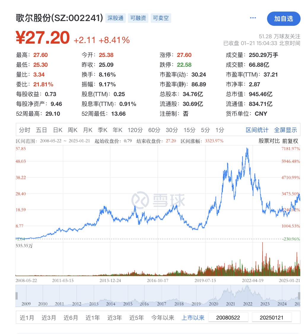 自2010年打入“果链”后,歌尔股份股价、业绩双双驶入快车道。2021年前后,其股价一度接近60元/股,市值最高更是突破2000亿元。截至1月21日收盘,歌尔股份涨8.41%报27.20元/股,总市值945.46亿元。