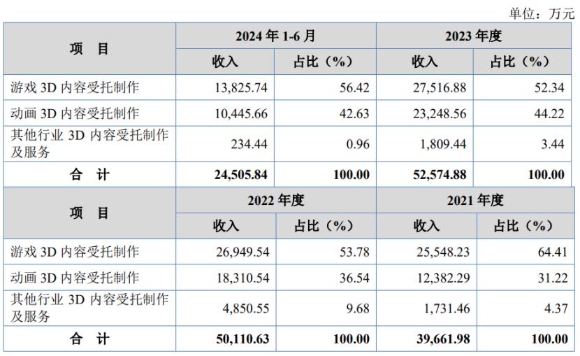 2024年上半年,游戏3D内容受托制作业务、动画3D内容受托制作业务的营收占比分别为56.42%、42.63%,占比较大。
