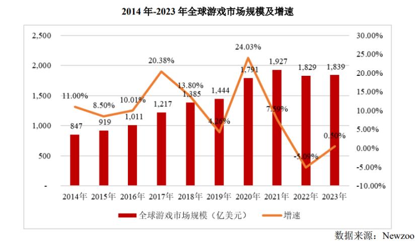 尽管2022年受游戏内容供给出现临时性不足、游戏用户付费意愿和付费能力下降及我国游戏版号部分时间暂停审批发放等影响,游戏行业的市场规模呈现出一定程度的下滑,但2014年至2023年全球游戏市场规模年均复合增长率依然达到9%,2023年全球游戏市场规模达到1839亿美元。