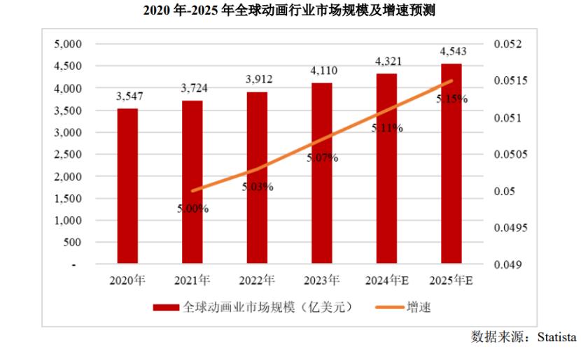 据Statista数据显示,2021年全球动画行业市场规模为3724亿美元,预计2020年至2025年全球动画行业市场规模复合增长率将达到5.07%。
