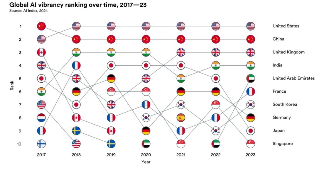 上图则显示了2017年至2023年全球AI活力不断变化的竞争态势。它揭示了三个不同的竞争层次:第一层始终由美国和中国主导;第二层较为稳定,包括英国和印度;第三层则变化较大,法国、德国、日本、新加坡和韩国等国家在此层中经常互换位置。