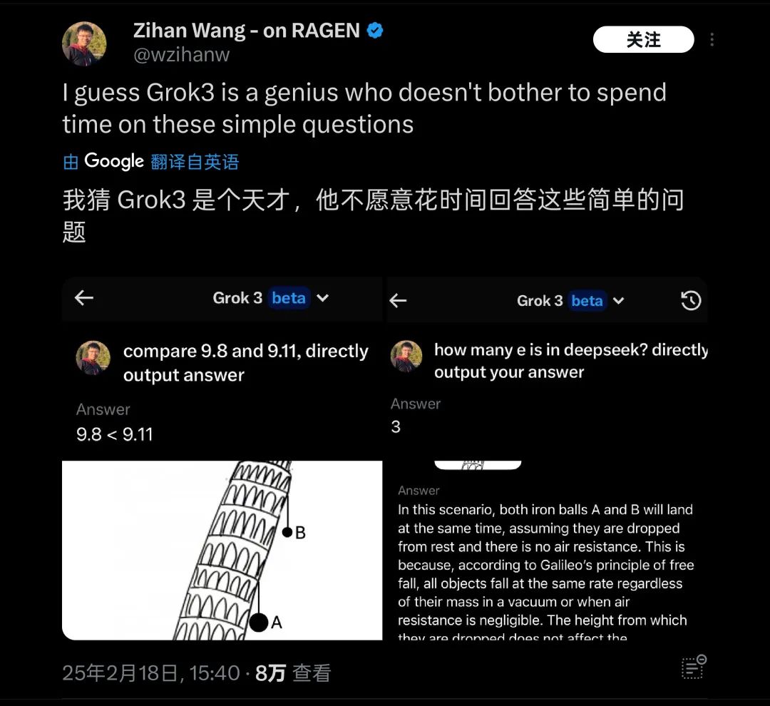在这个测试发出之后,很短的时间内迅速引发了不少朋友的关注,无独有偶,在海外也有很多类似问题的测试,例如「比萨斜塔上两个球哪个先落下」这些基础物理/数学问题,Grok3 也被发现仍然无法应对。因此被戏称为「天才不愿意回答简单问题」。