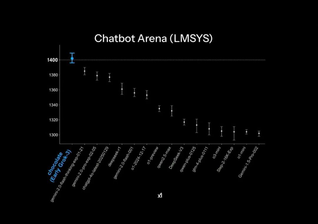 Grok3 在发布中官方的 PPT 中,在大模型竞技场 Chatbot Arena 中实现「遥遥领先」,但这其实也应用了一些小小的作图技巧:榜单的纵轴仅列出了 1400-1300 分段的排名,让原本 1% 的测试结果差距,在这个 PPT 展示中都变得异常明显。